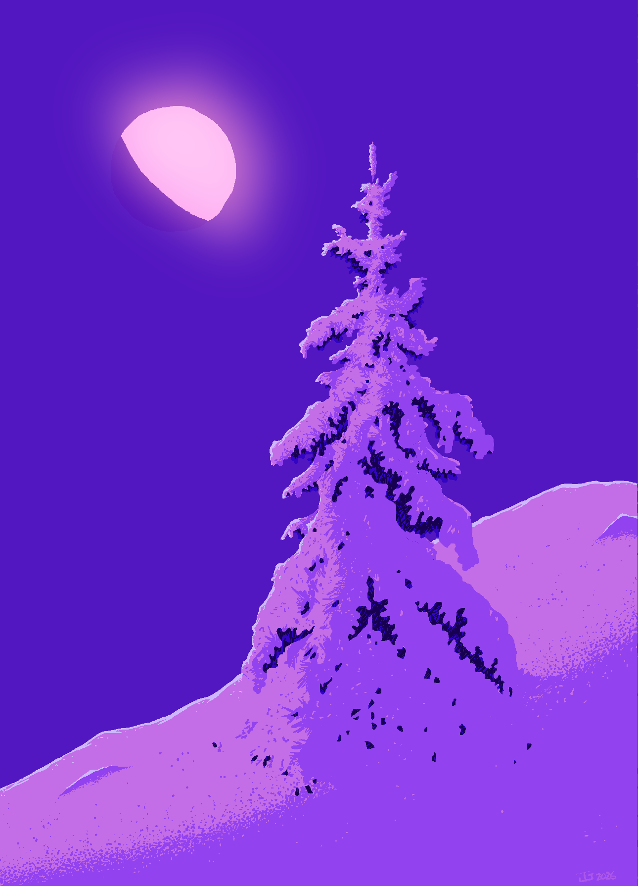The purpose behind this simple composition was to get more practice digitally inking and colouring my pencil sketches in Clip Studio Paint. I love drawing snow covered pine trees like this. I’ve also found when colouring these pieces that I’m really drawn to sunrise or sunset scenes. I love the colours and the long shadows of those times of day. Colouring a piece as if it is the middle of the day just doesn’t interest me.
